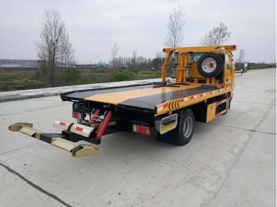 翻轉板:3噸上裝,4噸卷揚,21米鋼絲繩,3噸后拖臂,底板為花紋板(可選沖壓板),主板長4.1米,尾部液壓翻轉板,板長1米,雙側聯動操作,配四根捆綁帶,**小車一套,L型抱胎架一對,工具箱一個,LED工作照明燈一對,其余標配。